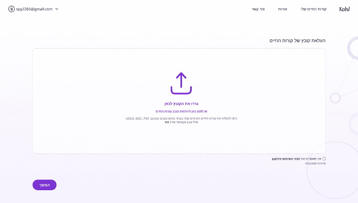 בעת בחירת אפשרות של בדיקת קו”ח ניתן להעלות את קורות החיים הקיימים